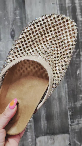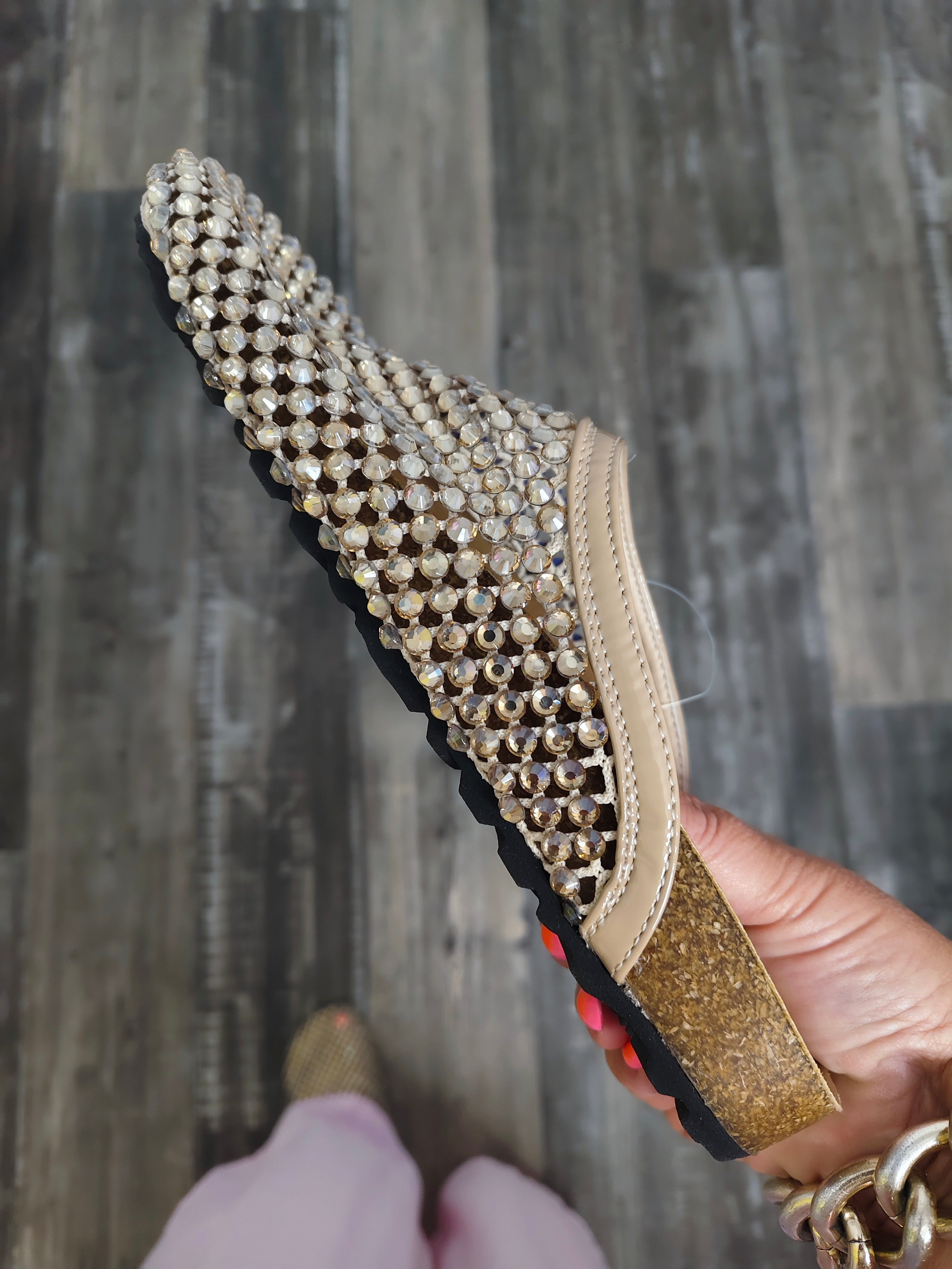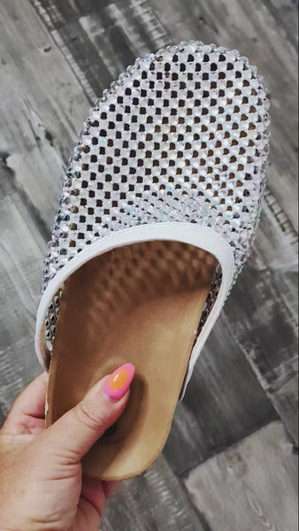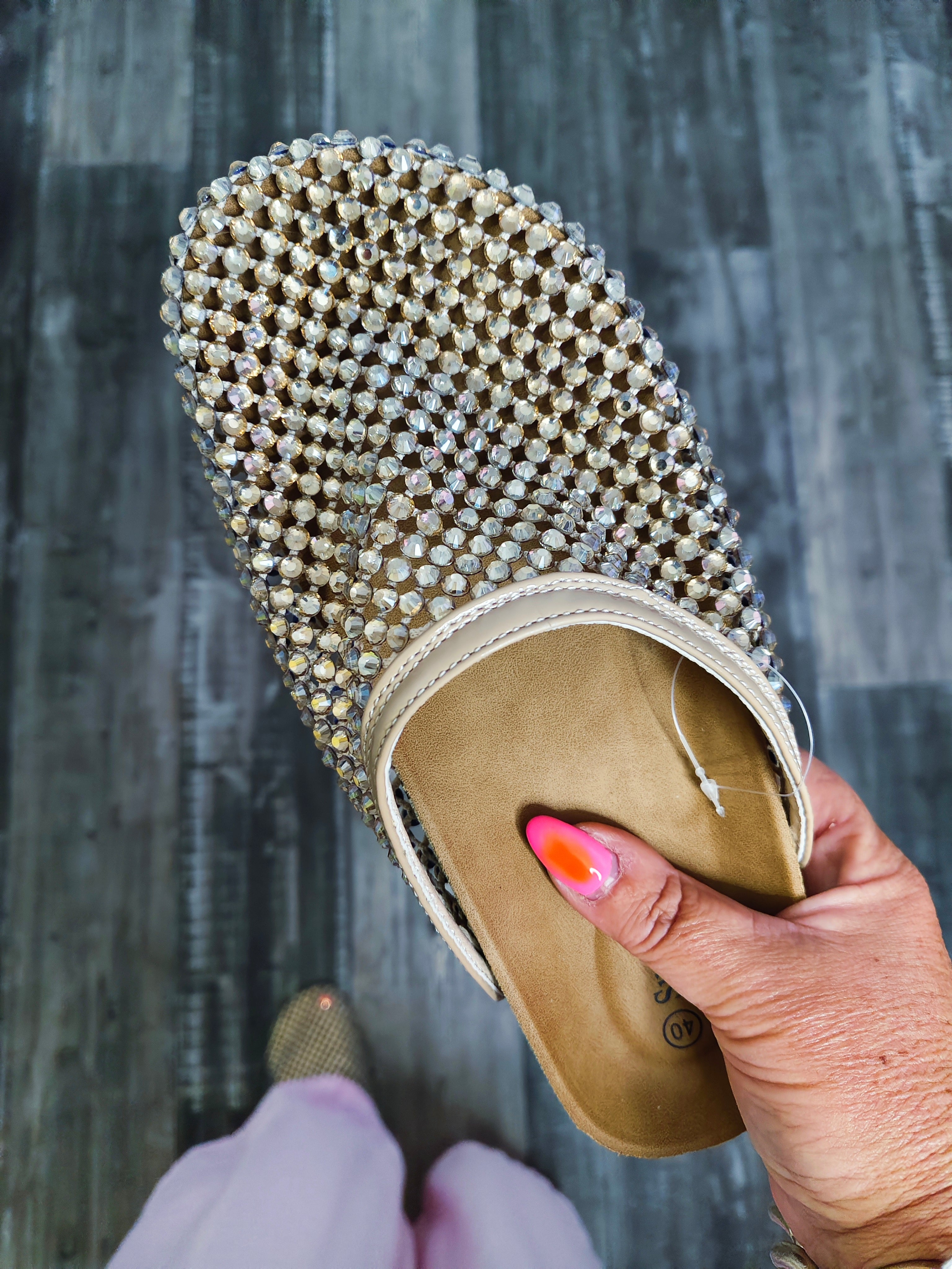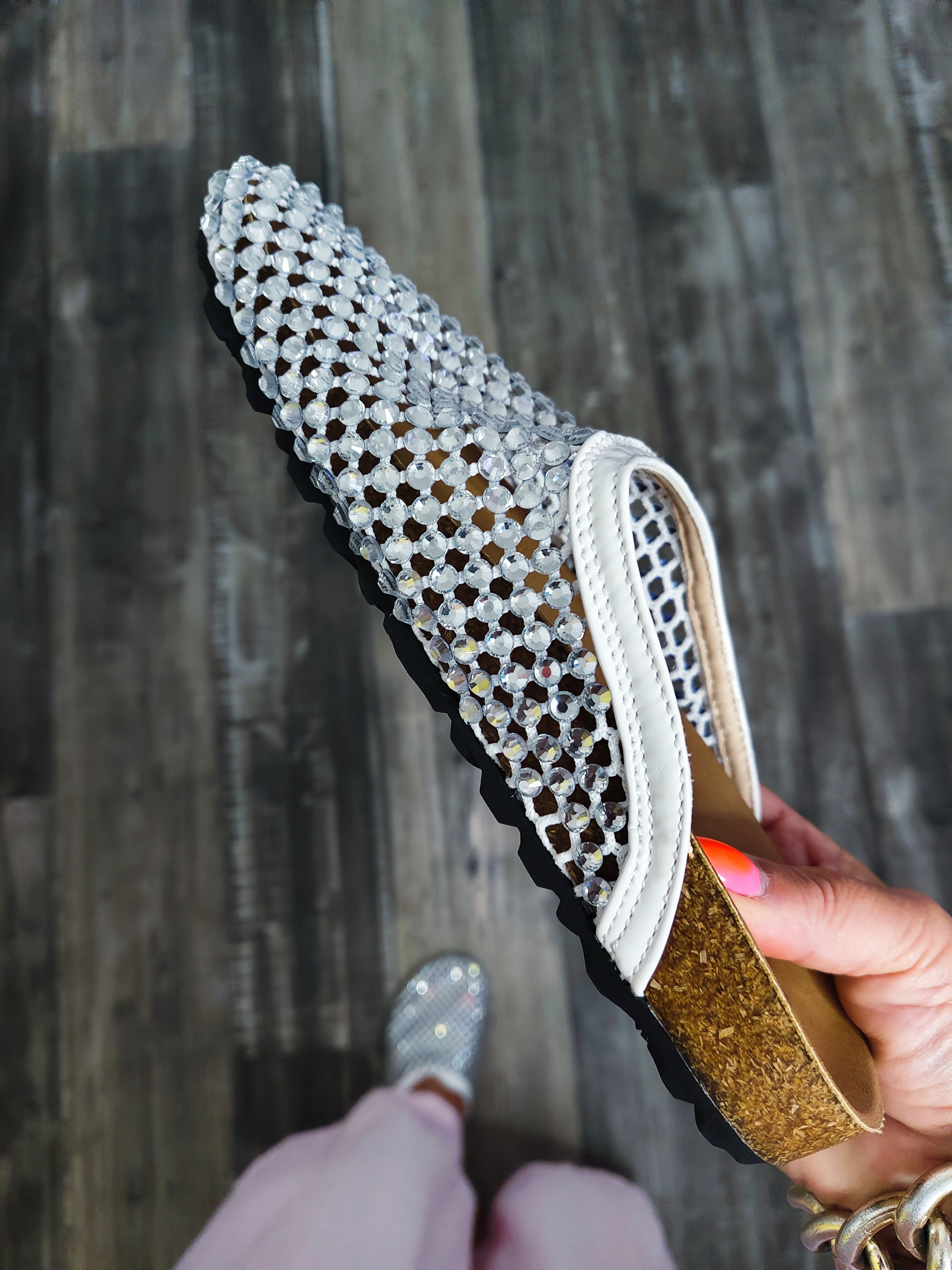 A classic mule goes glam with airy mesh construction and shimmering crystal embellishments.